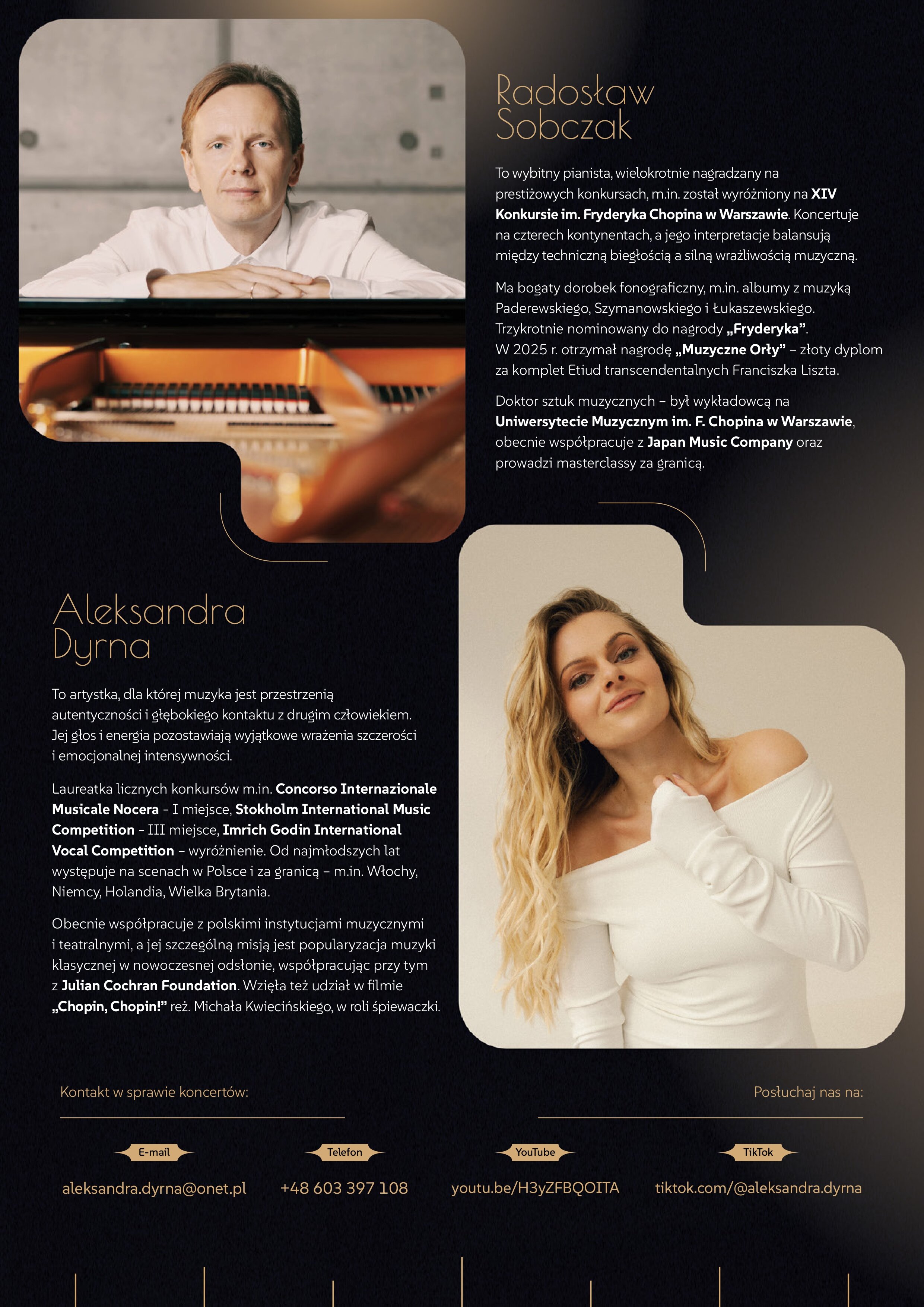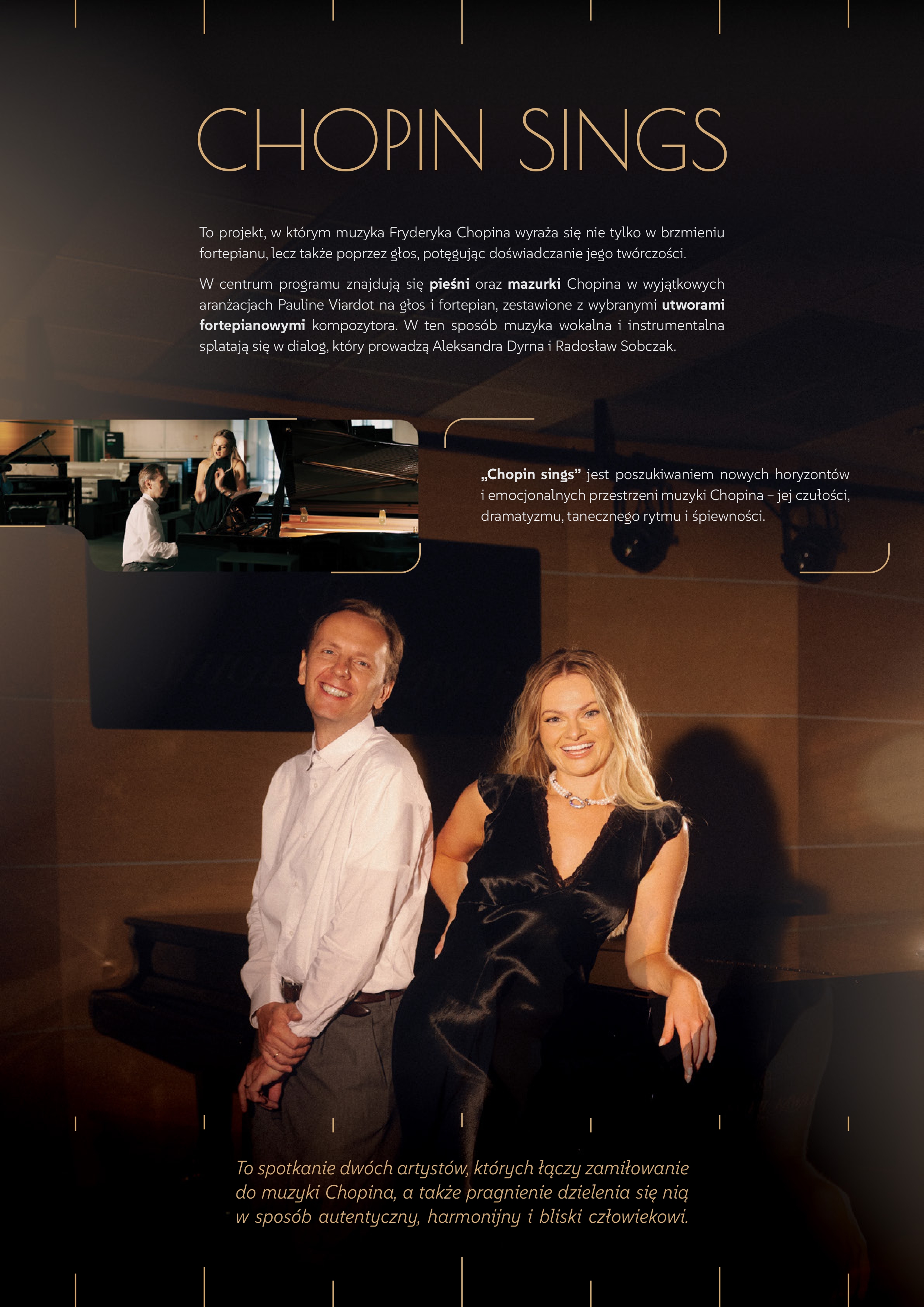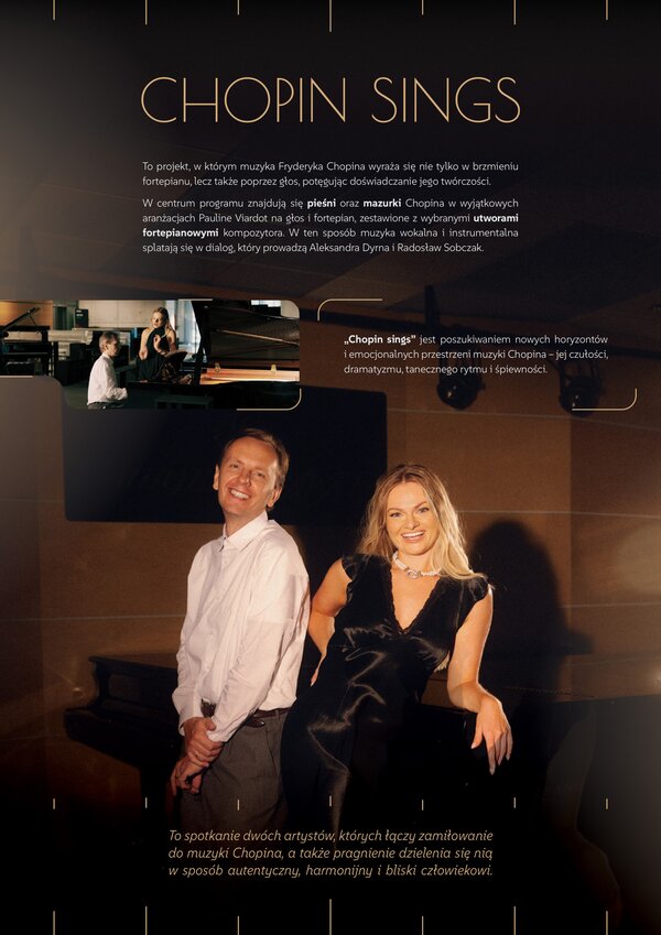 „Chopin sings” jest poszukiwaniem nowych horyzontów i emocjonalnych przestrzeni muzyki Chopina – jej czułości, dramatyzmu, tanecznego rytmu i śpiewności. W centrum programu znajdują się pieśni oraz mazurki Chopina w wyjątkowych aranżacjach Pauline Viardot na głos i fortepian, zestawione z wybranymi utworami fortepianowymi kompozytora. W ten sposób muzyka wokalna i instrumentalna splatają się w dialog, który prowadzą Aleksandra Dyrna i Radosław Sobczak.